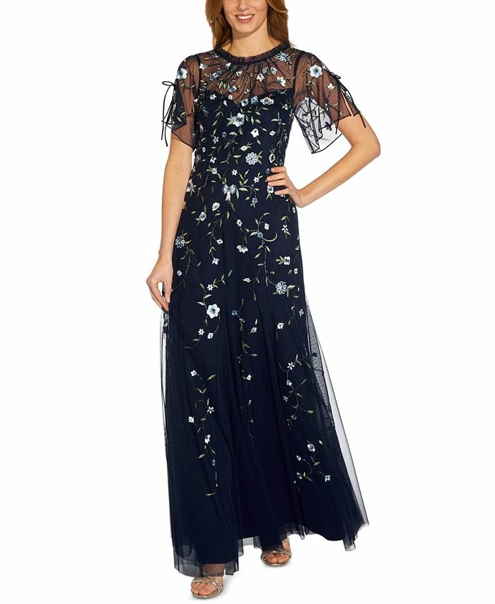 Luminous embellishments sparkle on the sheer top of layer of Adrianna Papell’s stunning split-sleeve gown.