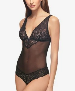 This on-trend eyelet-inspired lace and mesh bodysuit is the most chic first layer (or only layer!) a girl can wear. Stretch lace cups and adjustable straps keep everything perfectly placed, and the plunged neckline creates a figure flattering front view. The thong back enhances the rear view, ensuring 360 degrees of total hotness.