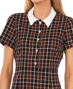 CeCe elevates a retro-inspired look with a Peter Pan collar and a stunning rhinestone button detail down the front.