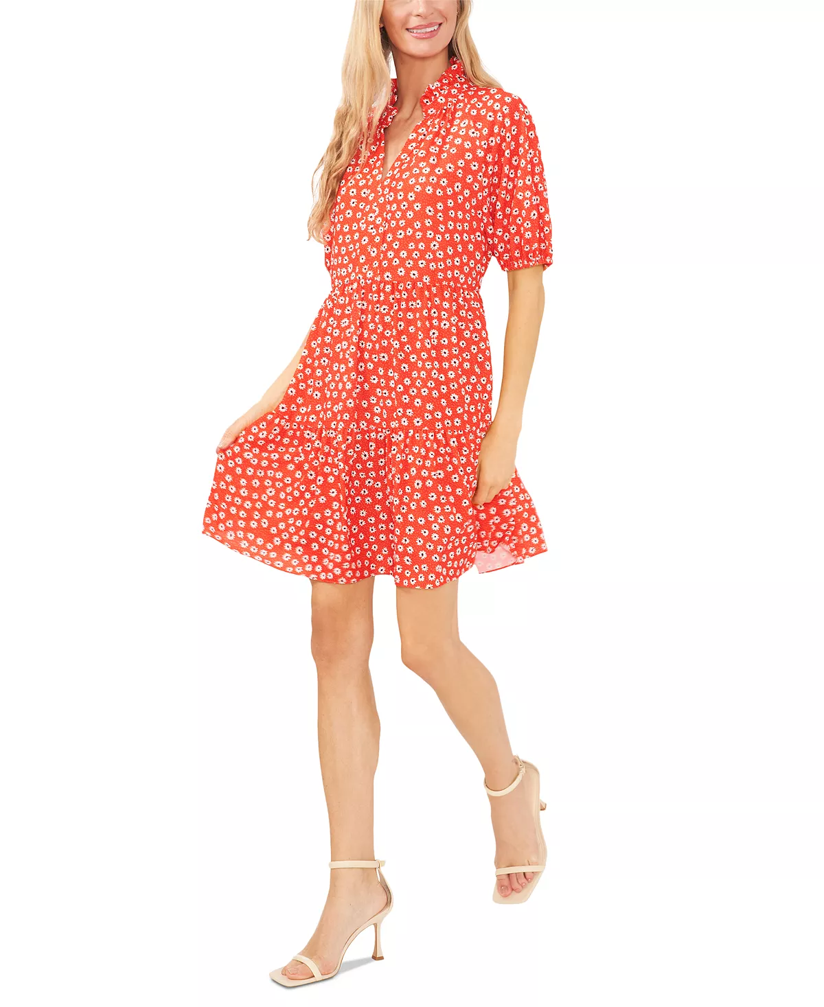 A youthful design in a fun floral print, put your best foot forward in this charming tiered dress from CeCe.