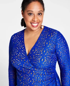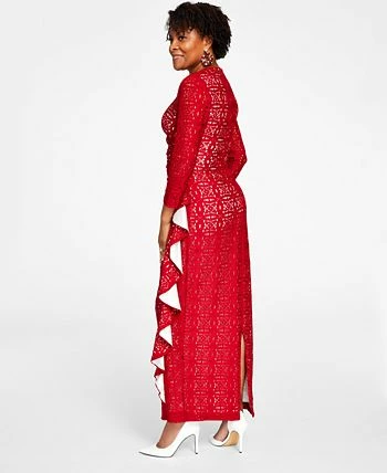 A contrasting color dramatically highlights the swirling lace designs of Kasper’s shapely surplice V-neck maxi dress. The cascading side ruffle finishes the lovely look with a flowy flourish.