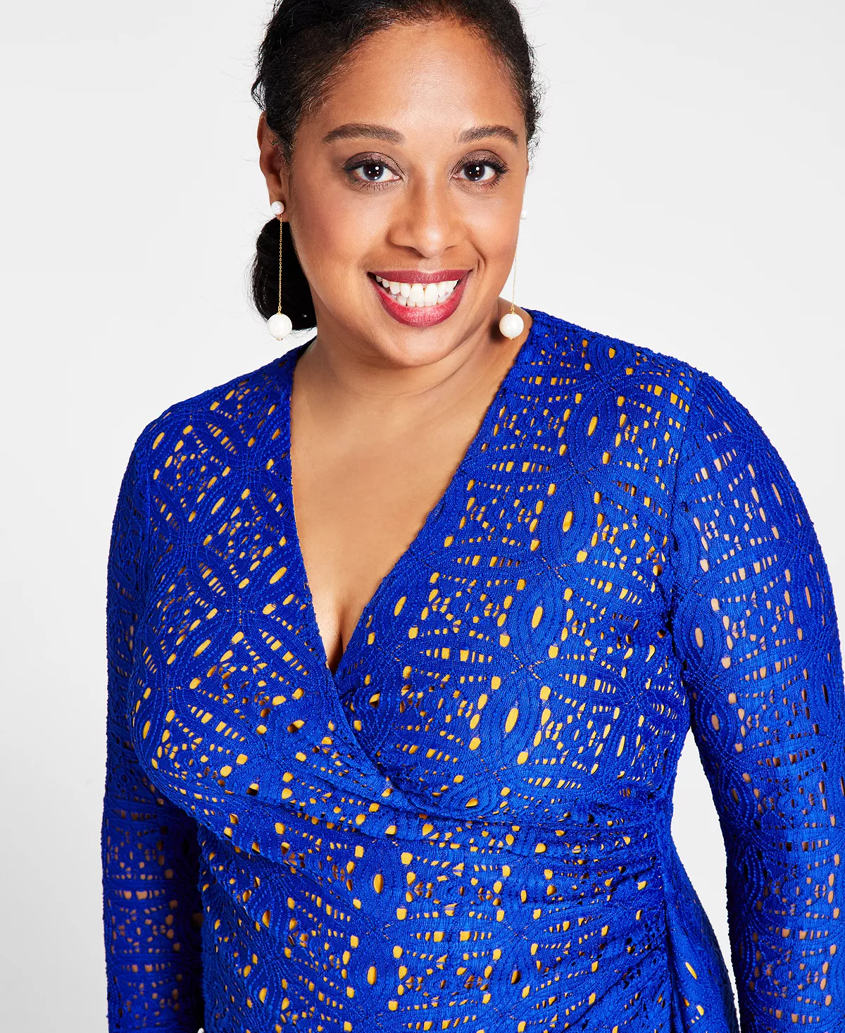 - Surplice V-neck; Bodycon silhouette