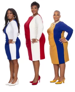 Kasper brings back graphic colorblocking with two-tone detail on this stunning sheath dress, ruched at front for flattering shape.