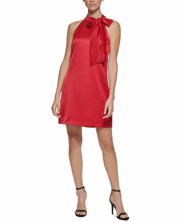 A gorgeous bow accents the neckline on this shimmery satin shift dress from Vince Camuto.