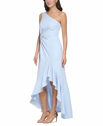 Achieving a beautiful balance of asymmetrical details, this Vince Camuto formal gown combines a one-shoulder design with a waistline twist at one side and a tulip-style hemline at the other.